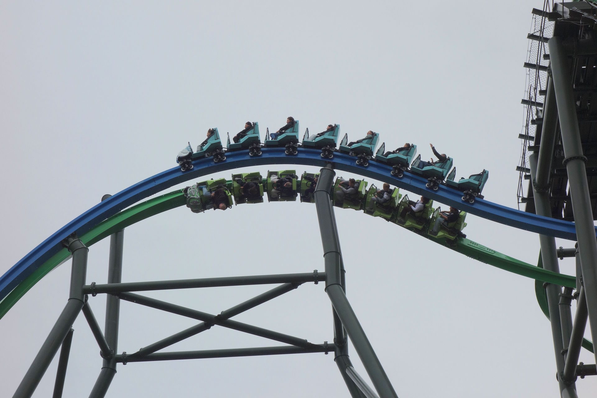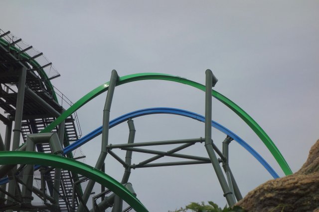 Die blaue Spur absolviert also eine lange Rechtskurve mit kurzer Geraden zwischendrin, auf welcher die Querneigung kurzzeitig auf etwa 90° ansteigt. Gleiches gilt für die grüne Spur, wobei hier die 90°-Neigung auf der kurzen Geraden eben entgegen der eigentlichen Kurvenrichtung nach links erfolgt, was zwei ordentliche Umschwünge zur Folge hat. Die Mitfahrer sollen durch die gegensätzliche Neigung den Eindruck bekommen, mit den nach oben ausgestreckten Armen ihrem Gegenüber im anderen Zug ein High Five geben zu können - daher der Name des Elements, welches ich selbst hier erstmals live erleben konnte. Ich glaube, es wäre direkt nach dem