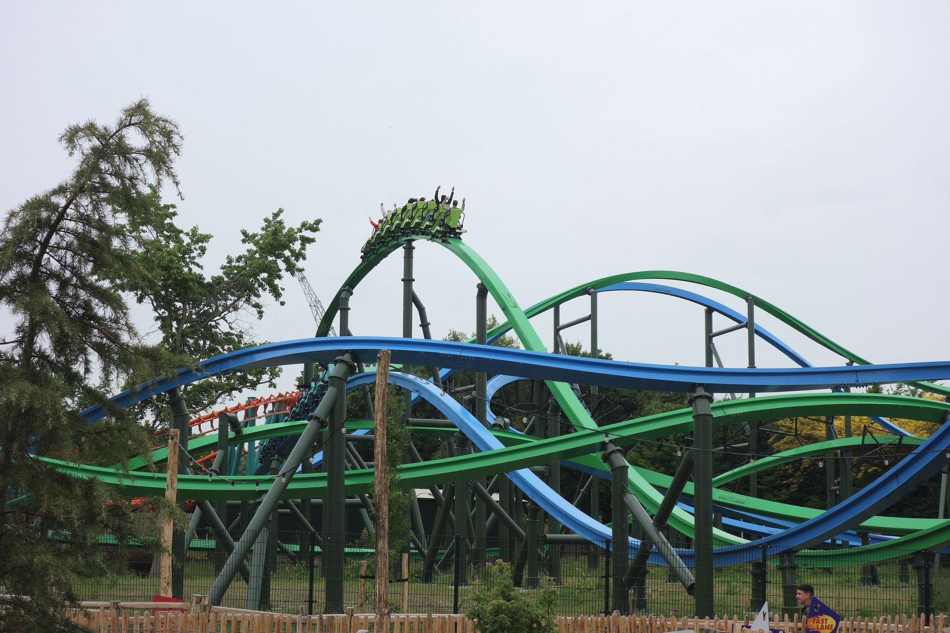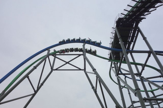 First Drop besser zur Geltung gekommen, denn durch die Kurvenfahrt sind die Züge selten wirklich parallel unterwegs. Außerdem muss sich die grüne Spur eben in die eigentlich falsche Richtung neigen, sodass es für die Weiterführung der Kurve sehr schnell wieder zurück gehen muss. Entsprechend hat man kaum Gelegenheit, den High-Five-Moment wahrzunehmen.