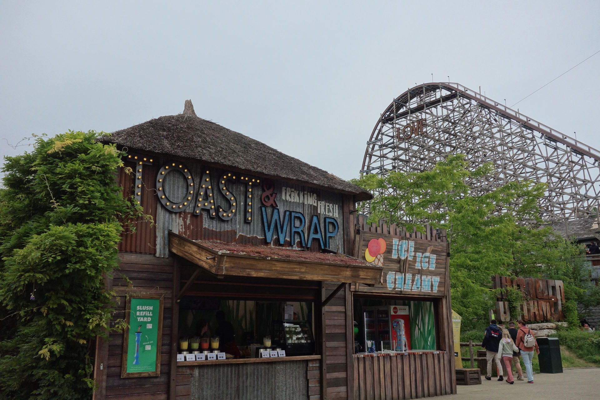 Inzwischen hatten sich weitere FKFler am ebenfalls neuen Flavors-Snack zu Füßen des Lifthills von YOY mit Terrasse direkt am Seeufer eingefunden und wir setzten uns nach den Fahrten erstmal dazu. Gerne hätte ich hier endlich mein "Frühstück" nachgeholt, auch wenn mich die Essensauswahl irgendwie nicht so richtig überzeugen wollte. Aber es gab wohl gerade eh Probleme mit der Kasse. Als Marek und Rieke sich auf den Weg machten, schloss ich mich einfach mal an - ich war ja nicht hier, um rumzusitzen. Außerdem dachte ich, die beiden wollten zu Goliath, den