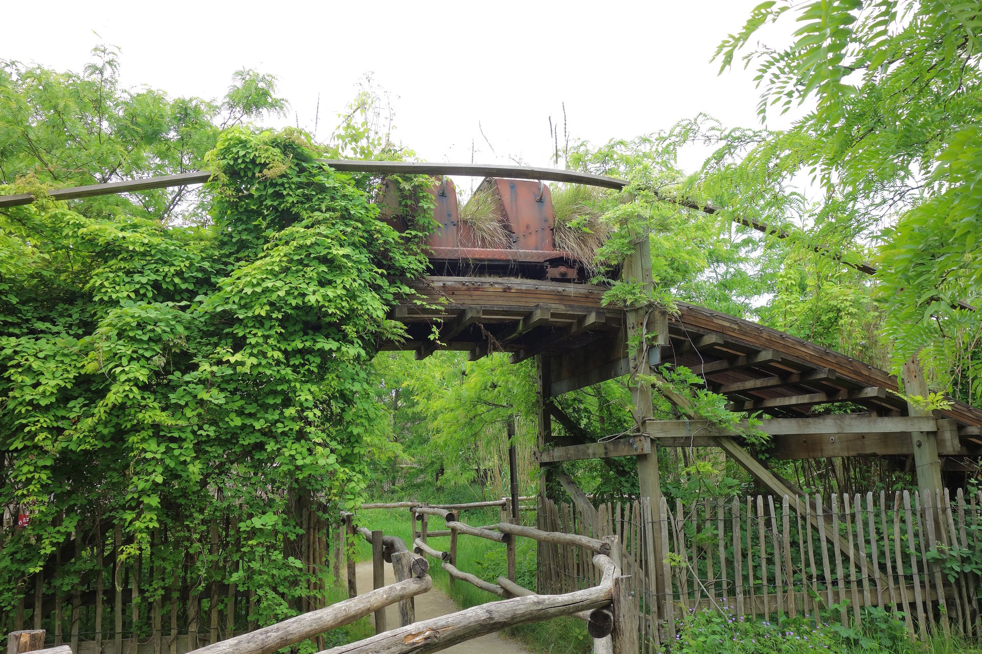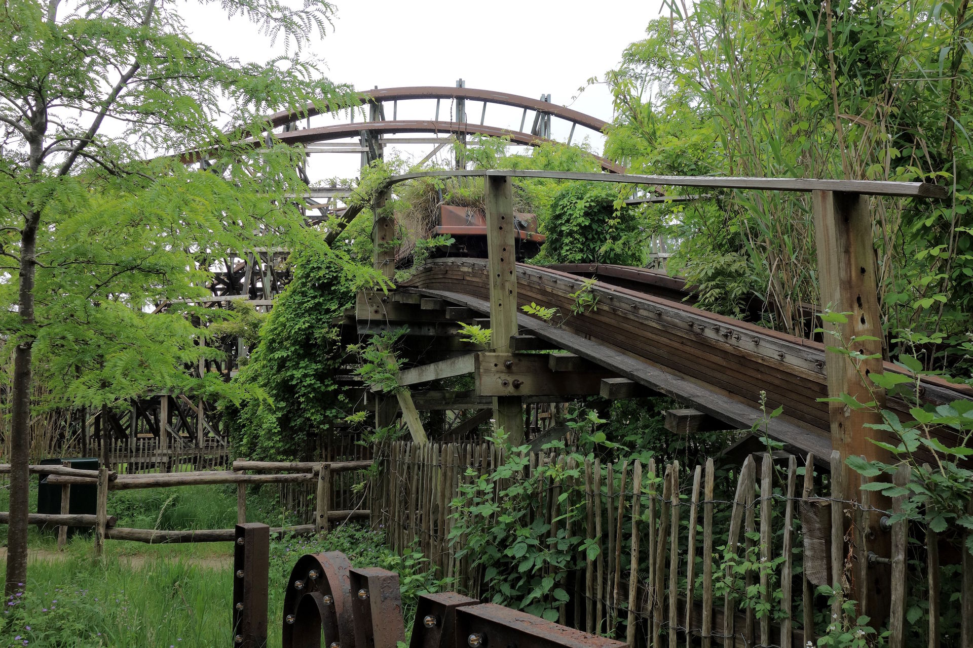 Ein Stück der alten Holzachterbahn-Strecke samt eines Wagens. Hat was von Lost Place.