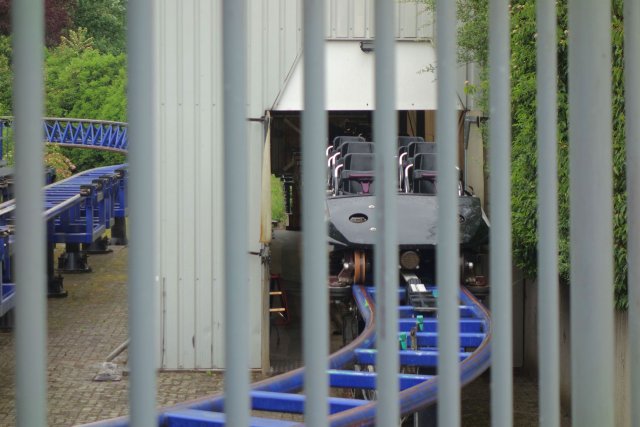 Während wir auf das Ende der noch laufenden Fahrt warteten, wunderten wir uns noch, was der Ride-Op in seinem Häuschen dauernd für einen Knopf drückte. Nachdem wir dann zur nächsten Fahrt eingestiegen waren und der Ride-Op endlich die Bügelkontrolle hinter sich gebracht hatte, wurde es recht bald klar. Mit dem Knopf wurde die Gondelbremse aktiviert. Die Fahrt bestand also aus einem ständigen Wechsel zwischen quietschendem Bremsen der einzelnen Fahrgastgondeln und dem zischenden Lösen eben dieser Bremsen. Ich kann mir nicht vorstellen, dass diese Betriebsweise gut für das Material ist. Dass es gut für das Fahrgefühl wäre, können wir in jedem Fall ausschließen...