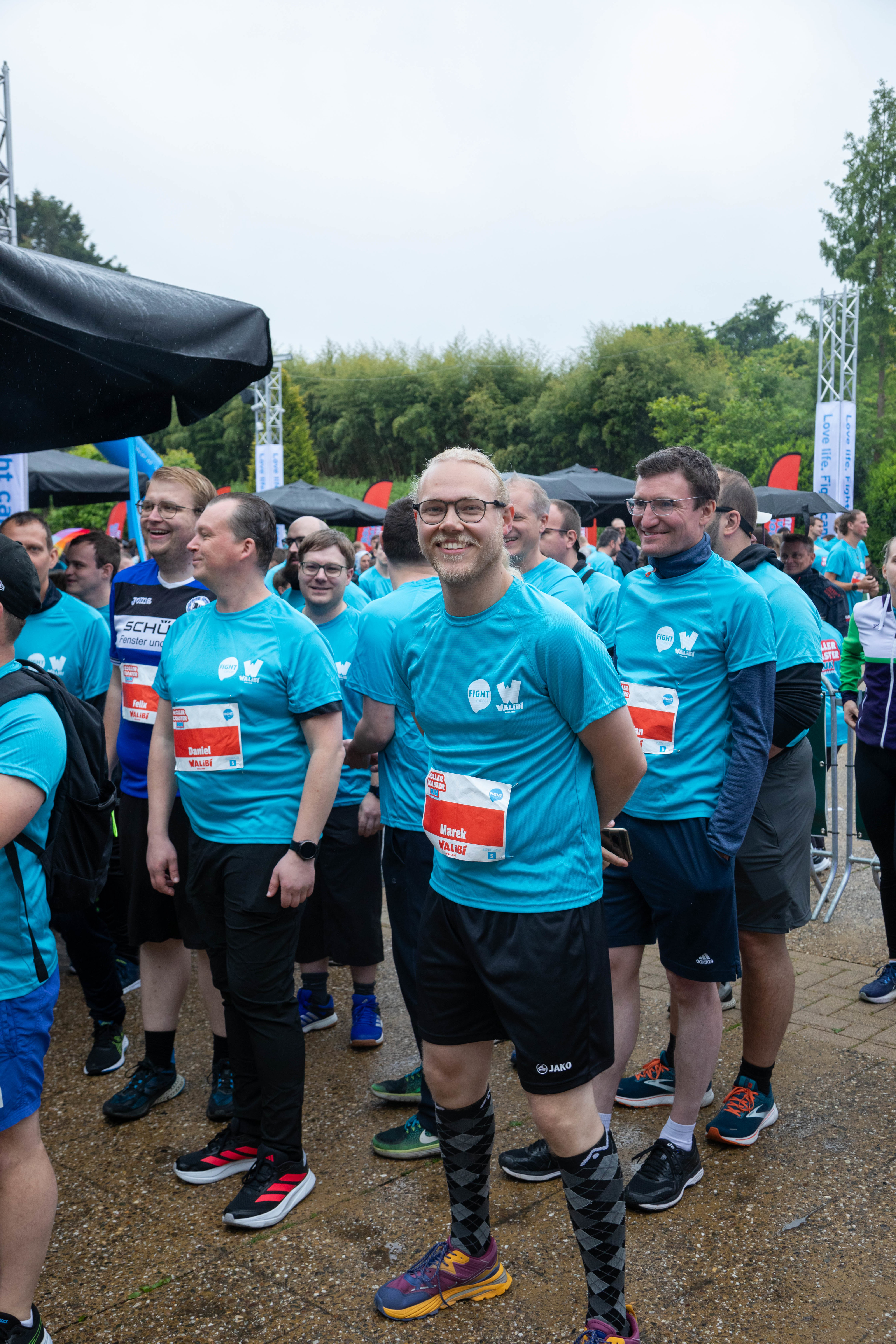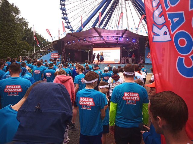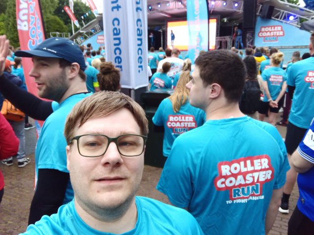 Beziehungsweise ging es für mich vorher noch schnell aus dem Park heraus zum Auto, um mich umzuziehen. Das FKF-Poloshirt wich dem offiziellen Rollercoaster-Run-Trikot, trotz des nasskalten Wetters entschied ich mich für die Dreiviertel-Sporthose (vor allem, weil die lange Hose keine Reißverschlusstaschen zur Unterbringung von Handy und Brillenetui hatte) und an die Füße schnallte ich die bis dahin erst einmal benutzten Turnschuhe. Gegen 18:15 Uhr begab ich mich dann endlich zur Bühne, wo das Vorprogramm bereits im Gange war. Für die Rückkehr in den Park reichte abermals das Tragen des richtigen Shirts. Der Regen hatte unterdessen nochmal leicht nachgelassen, während die am Business Run teilnehmenden Teams vorgestellt und die Läufer angeheizt wurden. Am Rande des Platzes konnte man sich mit ein paar Schildchen und optional der erzielten Spendensumme ablichten lassen.