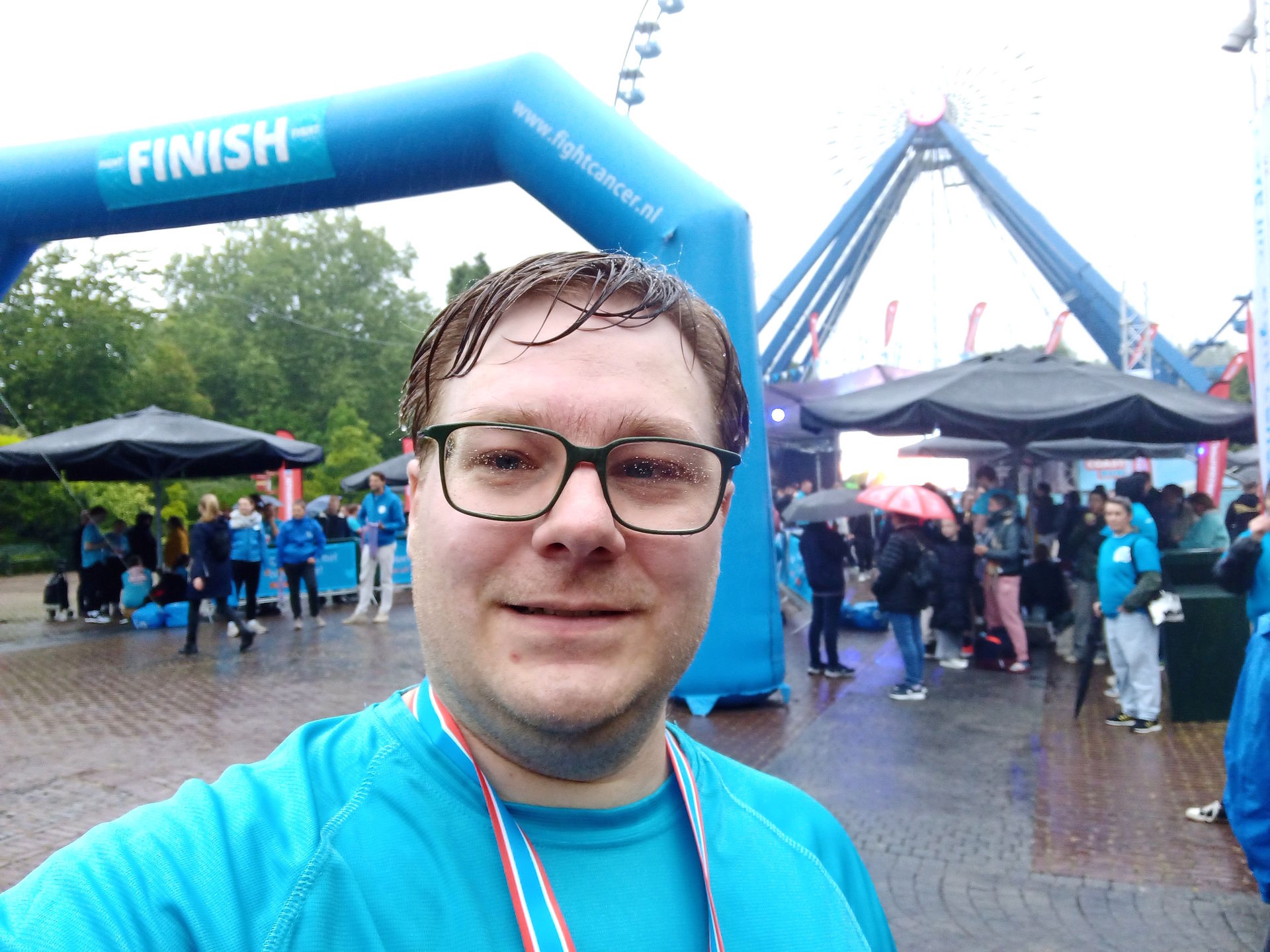 Schließlich konnten auch wir aber endlich durch den Haupteingang in die Main Street einbiegen, wo noch ein letztes Zwischenziel auf uns wartete. Denn es stand ja noch die dritte und letzte Achterbahnfahrt im Rahmen des Friends Runs aus, die auf Xpress stattfinden sollte. Hier erwies sich die alte Rampe zur Station mit ihrem Metallboden als tückisch, kamen die regennassen Sohlen darauf doch verdammt schnell ins Rutschen. Laufen wäre an dieser Stelle fatal gewesen. Auch hier konnte ich direkt einsteigen und wählte hierzu die letzte Reihe. Unmittelbar hinter dem Ausgang in der Hall of Fame wartete bereits ein Großteil der übrigen Läufer unseres Teams. Die letzten Meter bis ins Ziel sollten wieder gemeinsam absolviert werden. Und zu meiner Überraschung war ich nichtmal der langsamste. Bewusst hatte ich nur einen Teamkollegen im Walibi Village abgehängt, nachdem wir uns das Stück vom Parkplatz gemeinsam gequält hatten. Aber es fehlten sogar noch 1-2 andere, bei denen ich keine Ahnung habe, wann ich die überholt haben könnte. Beim gemeinsamen Zieleinlauf um 19:46 Uhr ließ ich es mir aber nicht nehmen, die letzten Kraftreserven für einen Schlussspurt abzurufen, mit dem ich aus der letzten Reihe am restlichen Team vorbeizog.