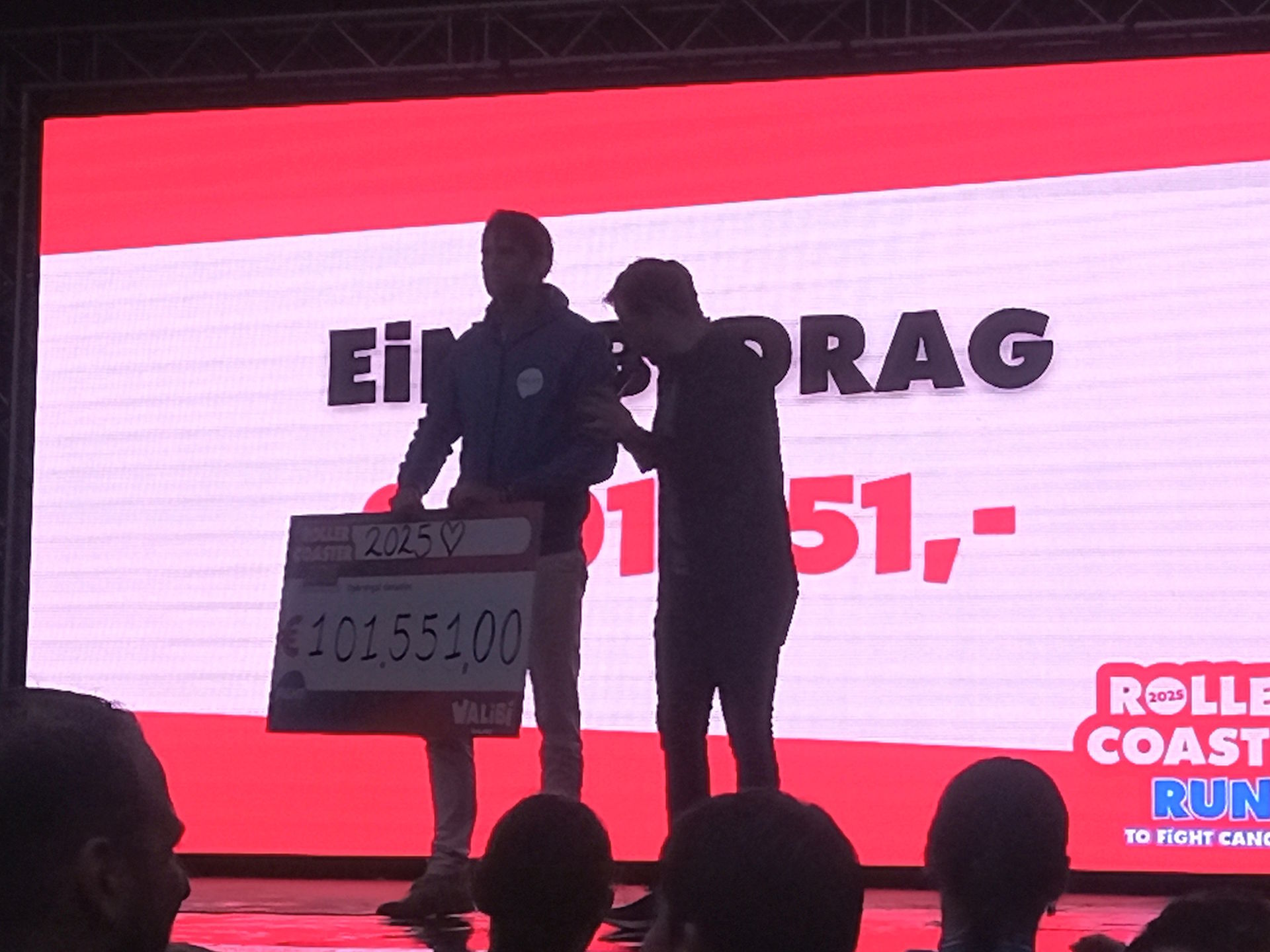 Außerdem standen limitierte Tragetaschen zum Verkauf, wobei sich in einer davon zwei Tickets für die Fright Nights samt Backstage-Führung verstecken sollten, und es wurden die schonmal erwähnten Preise für die Top-Spendensammler vergeben. Gegen 20:20 Uhr trat nochmal Walibi auf die Bühne, um die erzielte Spendensumme zu verkünden. Der Rekord vom Vorjahr konnte leider nicht geknackt werden, aber es kamen zum zweiten Mal in der Geschichte des Rollercoaster Runs über 100.000 Euro für die Krebsforschung zusammen.