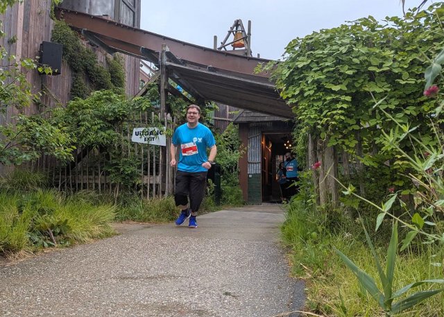 Ein Teil der übrigen FKF-Truppe füllte passenderweise gerade den gegnerischen Zug auf der Thrill-Spur. Die drei Plätze hinter mir blieben leer, sodass der vollere und damit schwerere FKF-Zug natürlich gewann. Durch die Leere auf der blauen Stationsseite ging zudem das Abfertigungs-Prozedere nicht auf. Statt nach der Gepäckablage auf den nächsten Zug zu warten, hatte ich ja direkt durchgehen und einsteigen können (wobei ich jetzt nicht weiß, ob das von Seiten der Mitarbeiter auch so gedacht war). Somit stand meine noch etwa viertelvolle Flasche nun im Zug 1 zugeordneten Spind, während ich aber aus Zug 2 ausstieg - oder halt andersrum. Entsprechend war die Rückseite des Spindes, in dem meine Wasserflasche stand, noch verschlossen. Den Rest Wasser wollte ich zwar ungern vergeuden, aber groß Aufhebens wollte ich darum auch nicht machen. Also lief ich nach kurzem Zögern einfach weiter. Vom Ausgang der Bahn wurde man rechtsherum geleitet, wieder in den Backstage-Bereich des Parks. Über den Service-Weg entlang von Goliath ging es vor in Richtung Parkplatzzufahrt. Bis zur Schranke kurz hinter der Wende des Mega Coasters und dann auf gleichem Wege wieder zurück bis zu einem Abzweig in Richtung Haupteingang. Mit dem Family Run bog man dort direkt ab und sparte sich das Hin und Her. Marek passte uns hier ab und fotografierte die einzelnen Läufer unseres Teams in Aktion. Zeigen möchte ich das Bild mit mir aber nicht, darauf sehe ich noch bescheuerter aus als oben beim Verlassen von Untamed.