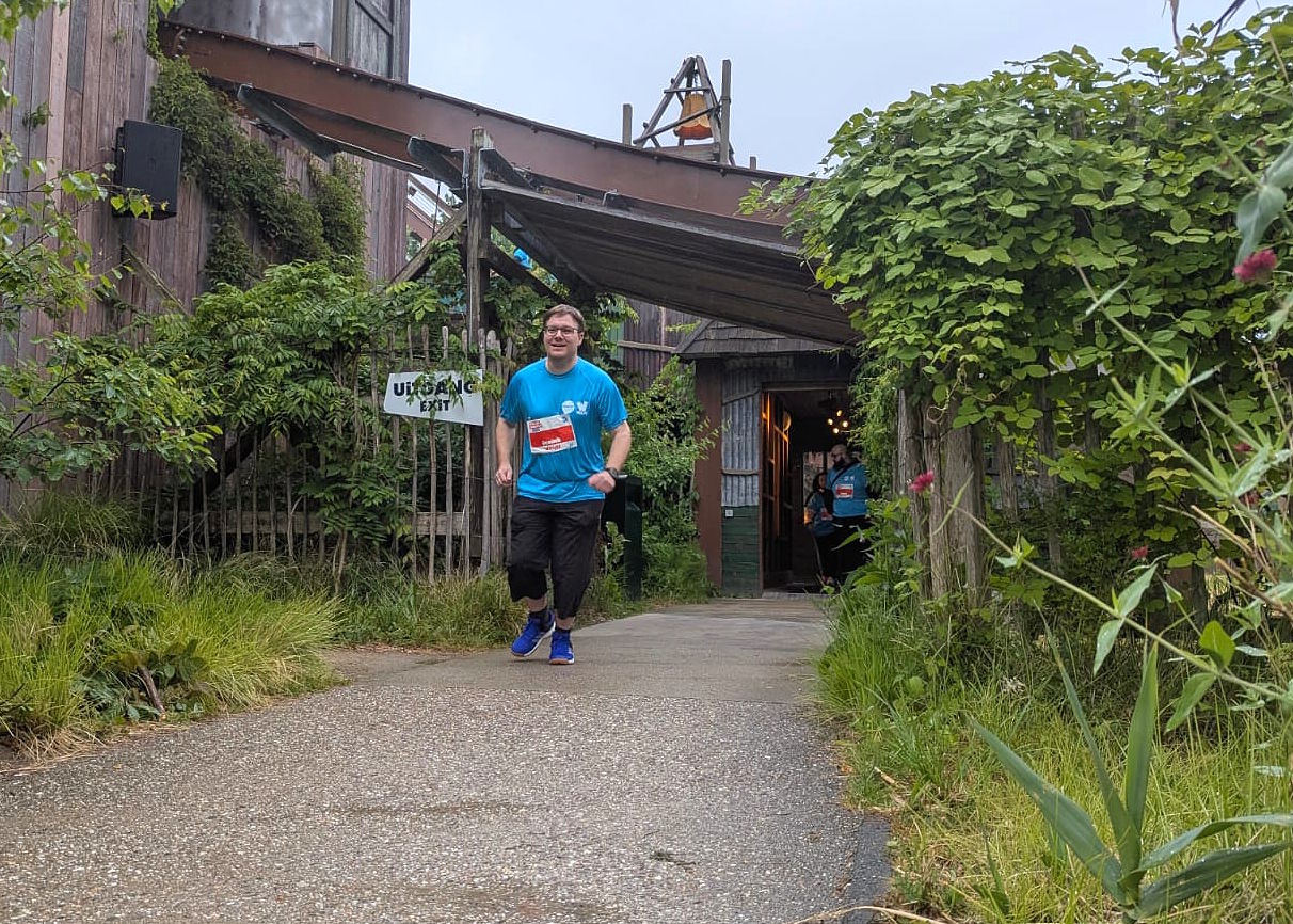 Stattdessen spuckte uns der Service-Weg enttäuschenderweise nahe des Eingangsbereichs auf den Parkplatz, wo ich zunächst die ansonsten gute Ausschilderung der Route vermisste. Aber entlang der gesamten Strecke waren ja zahlreiche Freiwillige postiert, welche die vorbeikommenden Läufer unentwegt anfeuerten und auf der vorgesehenen Route hielten. Außerdem wären sie natürlich im Fall der Fälle als Ersthelfer zur Stelle gewesen, wenn es zu einem Sturz oder anderen medizinischen Problemen gekommen wäre. Ich selbst hatte zwar zwischenzeitlich mit Seitenstechen zu kämpfen und musste immer wieder für einige Meter auf Gehen zurückschalten (was auch absolut kein Problem darstellt, jeder kann sein Tempo frei wählen), mir reichte aber das weisen des rechten Weges. Und der führte nun leider im etwas demotivierenden Zick-Zack über mehrere Parkreihen. Dass die ersten Läufer tatsächlich schon aus dem Park heraus zu ihren Autos gingen und davonfuhren, machte die Sache nicht unbedingt besser.