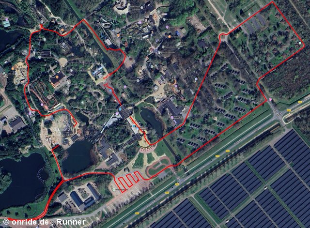 Der Lauf sollte am Abend nach Schließung des Parks stattfinden, aber natürlich war in der Anmeldegebühr auch ein Ticket für den Tag enthalten. Anfangs der Woche - also recht kurzfristig - bekamen wir hierzu einen Code zugeschickt, der im Ticketshop zu einer Freikarte umgewandelt werden konnte. Also ich zumindest. Einige in der Gruppe hatten wohl Probleme, dass der Code als ungültig nicht akzeptiert wurde. Mit einem neuen Code konnten sich aber letztlich alle ihr Ticket sichern. Außerdem hätten im Zuge dieses Vorgangs auch vergünstigte Tickets für Supporter - also Begleiter, die nicht für den Lauf angemeldet sind, sondern nur anfeuern wollen - erworben werden können. Ein Parkplatzticket war indes nicht vonnöten, da die Ausfahrtsschranken nach dem Lauf einfach geöffnet wurden. Am Eingang hatte ich dann allerdings das Problem, dass der zunächst gescannte kleinere Barcode auf dem Ticket mit einer Fehlermeldung abgelehnt wurde. Der größere Barcode wurde aber erkannt und ich konnte das Drehkreuz passieren. Bei den anderen wurde später dann schon direkt von einem Mitarbeiter gescannt.