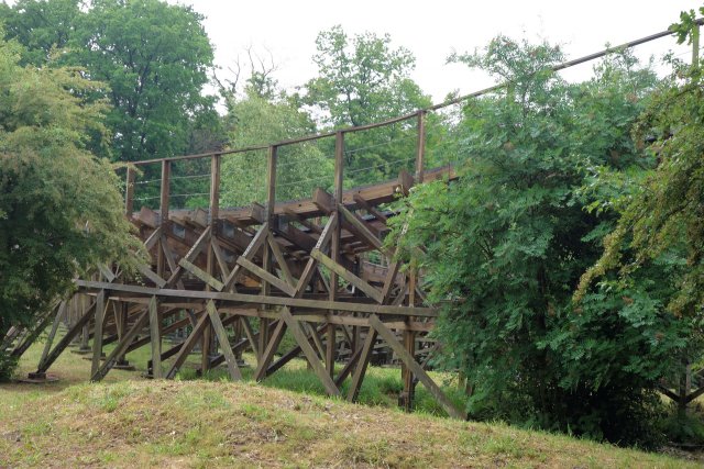 Eigentlich wollte ich den schmalen Holzsteg an der Außenseite des Piraña-Stationsgebäudes nutzen, um zu Joris en de Draak zu gelangen. Allerdings hatte man dort zwischen dem Rafting und der Holzachterbahn für den Bau von Danse Macabre eine breite Baustellenzufahrt quer über den See angelegt. Dieser ist wohl auch der alte Steg zum Opfer gefallen, für mich führte der Weg lediglich die Rampe aufs Dach des Gebäudes hinauf. Von dort gibt es zwar auch eine Treppe hinunter auf die Baustraße, die war aber natürlich abgesperrt.