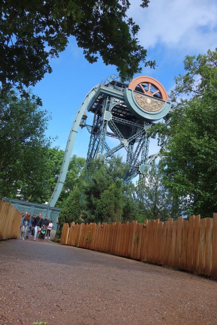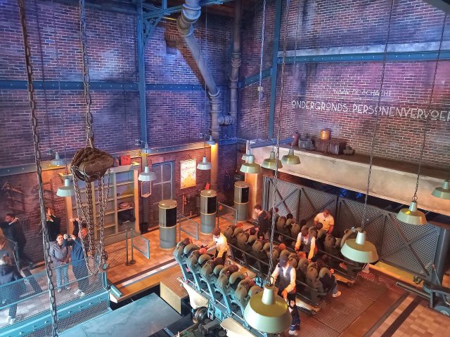 Soweit hatte ich allerdings nicht gedacht, weshalb ich bei der Pre-Show meine Niederländisch-Kenntnisse bemühen musste - das Lesen der Übersetzungen war mir trotz nicht allzu kleiner Schrift nämlich ohne meine Brille etwas zu anstrengend. Hat man es dann in den breiten Zug mit seinen sechs Sitzen pro Reihe geschafft, geht es durch das große Tor zur zweiten Pre-Show, dann wird der Förderturm mit seiner filigranen Gitterkonstruktion erklommen.