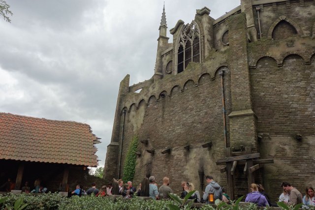 Und mittendrin ragen die Ruinen einer verlassenen Abtei empor, wo an einem Freitag, dem 13. im Jahr 1876 ein internationaler Musikwettbewerb stattgefunden hat. Der Dirigent Joseph Charlatan führte dabei mit seinem Orchester den Totentanz auf und kurz darauf waren die Musiker allesamt spurlos verschwunden. Daraufhin wurde die verfluchte Abtei verlassen und verfiel über die Jahre. Lediglich die 20 Meter hohe Kapelle des Klosters ist noch weitestgehend erhalten. Außerdem finden sich am Rande des Abteiplatzes noch das alte Kutschenhaus 't Koetshuys mit Popcorn- und Zuckerwatteverkauf, sowie direkt am Hauptweg zwischen Piraña und Max & Moritz die Taverne In den Swarte Kat mit den Toiletten De Laetste Hoop. Und mit Dr. Charlatans Kwalycke Zaken gibt es natürlich auch einen Souvenirladen im Bereich der Kapelle, in dem man von der Attraktion kommend landet.