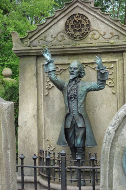 Aber genug der Entspannung, es wird Zeit, dass die Dynamic Motion Stage zeigt, was in ihr steckt. Das Licht wird wieder dunkler, die Musik schneller, lauter und dramatischer. Entsprechend rasant werden nun die Drehungen und die Platte nimmt ihre maximale Neigung an. Während sich die hochgestellte Seite der Decke nähert, taucht der untere Teil der Platte in den Keller der Kapelle ab. In der Krypta findet sich eine weitere Spookslot-Referenz, denn in einer Nische steigt Esmeralda aus ihrem Sarg. Im Spukschloss die Tochter des verfluchten Grafen, bei Danse Macabre wohl die Frau des verschwundenen Dirigenten. Ansonsten gibt es da unten aber leider nicht so viel zu sehen, weshalb die maximale Neigung auch nur kurzzeitig genutzt wird. Schade, da hätte ich mir noch etwas mehr gewünscht. Dennoch schaukelt man im weiteren Verlauf der Fahrt noch recht ordentlich durch den Raum. Bei meiner ersten Fahrt stoppte die Platte allerdings kurze Zeit später recht plötzlich in leicht schräger Position mit allen Chorbänken in Drehrichtung ausgerichtet und das große Licht ging an. Die Balustraden tanzten zwar unbeirrt weiter und die Geigenprojektion fidelte von Herrn Charlatan dirigiert ebenfalls vor sich hin, die Musik war jedoch verstummt. Ausgerechnet bei meiner Premierenfahrt hatte Danse Macabre offenbar den Geist aufgegeben.