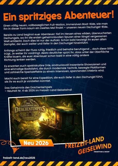 Das Freizeitland präsentiert, neben der bereits bekannten "Neuheit" aus den Schwabenpark zusätzlich 4 neue Attraktionen: