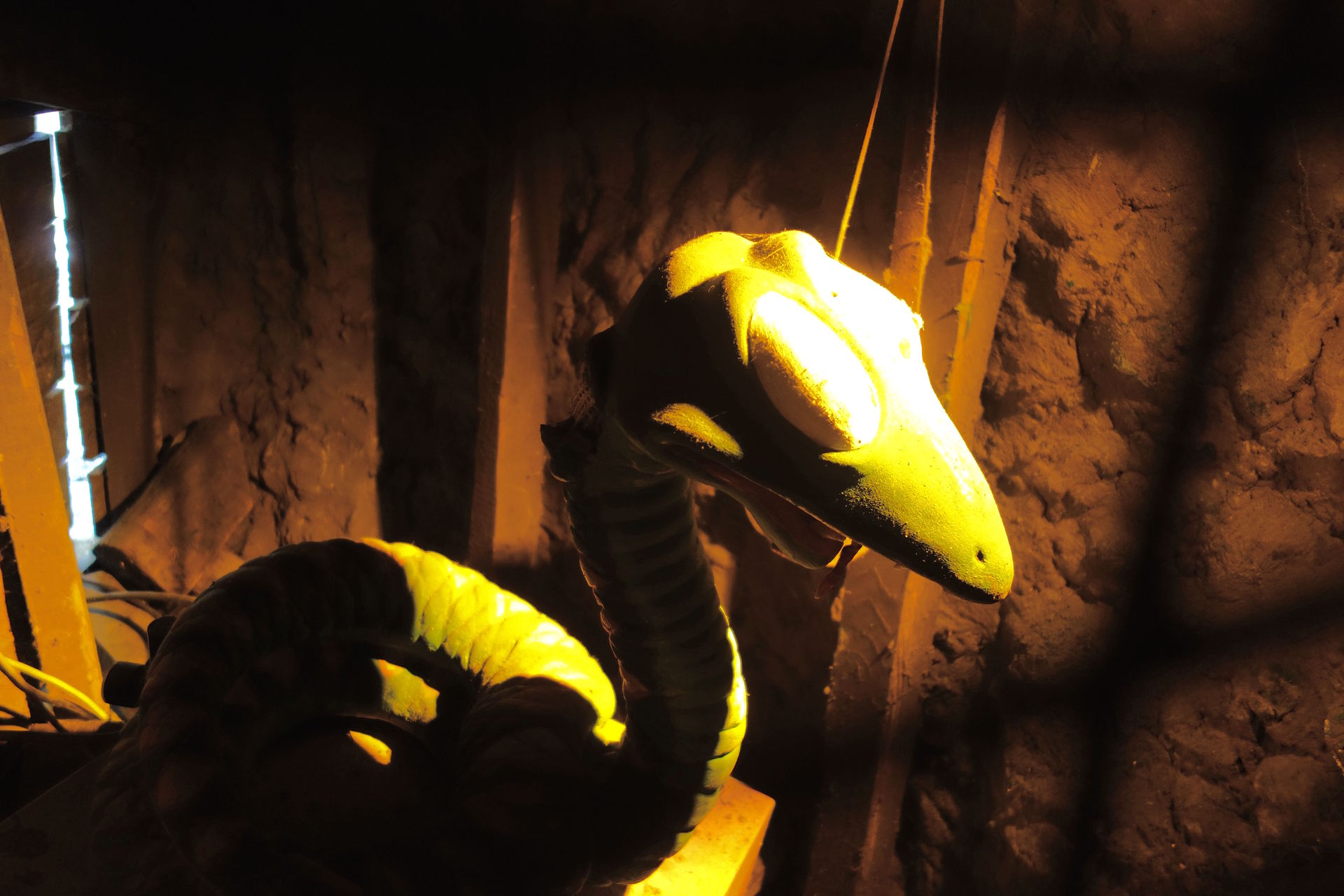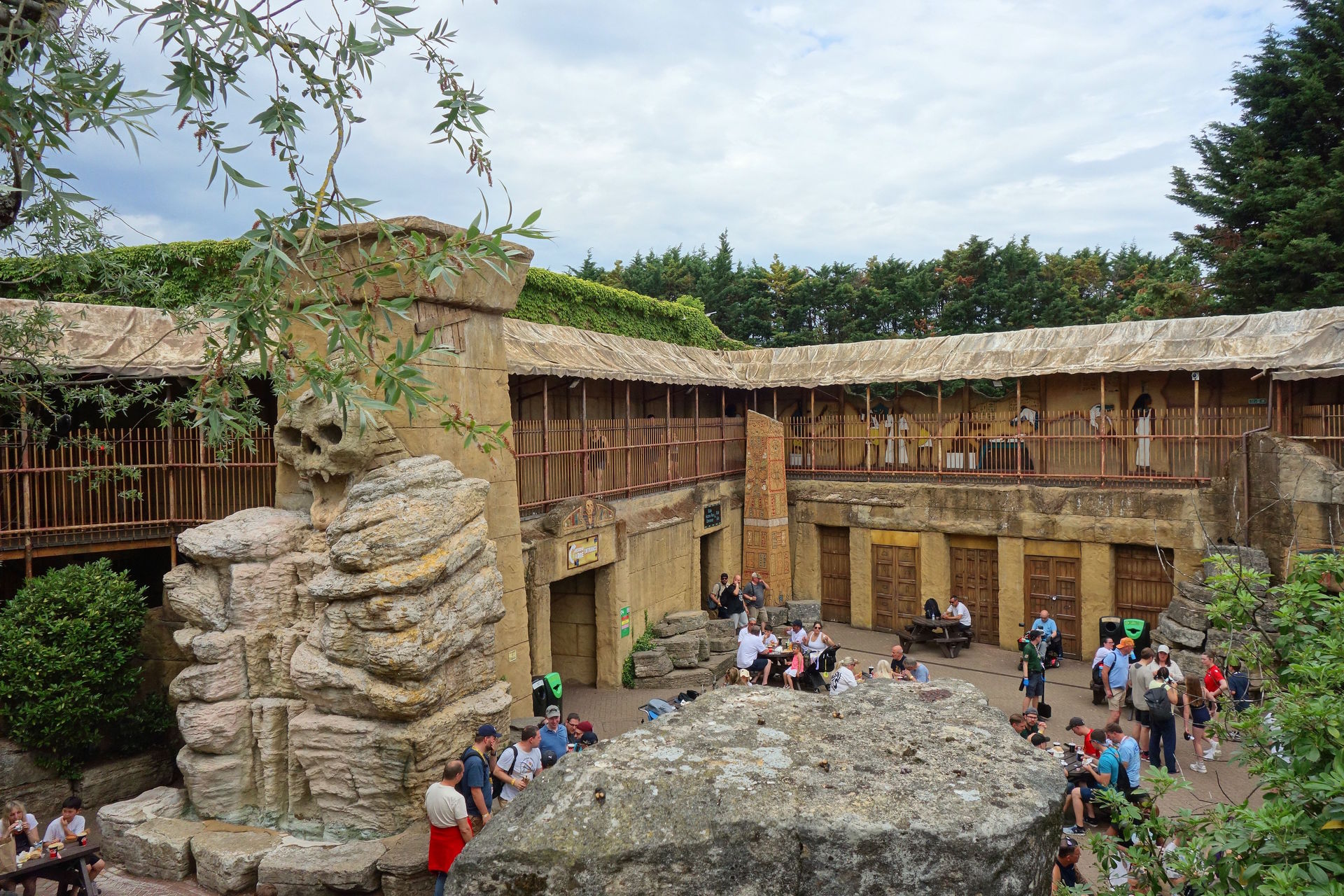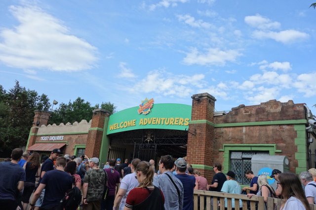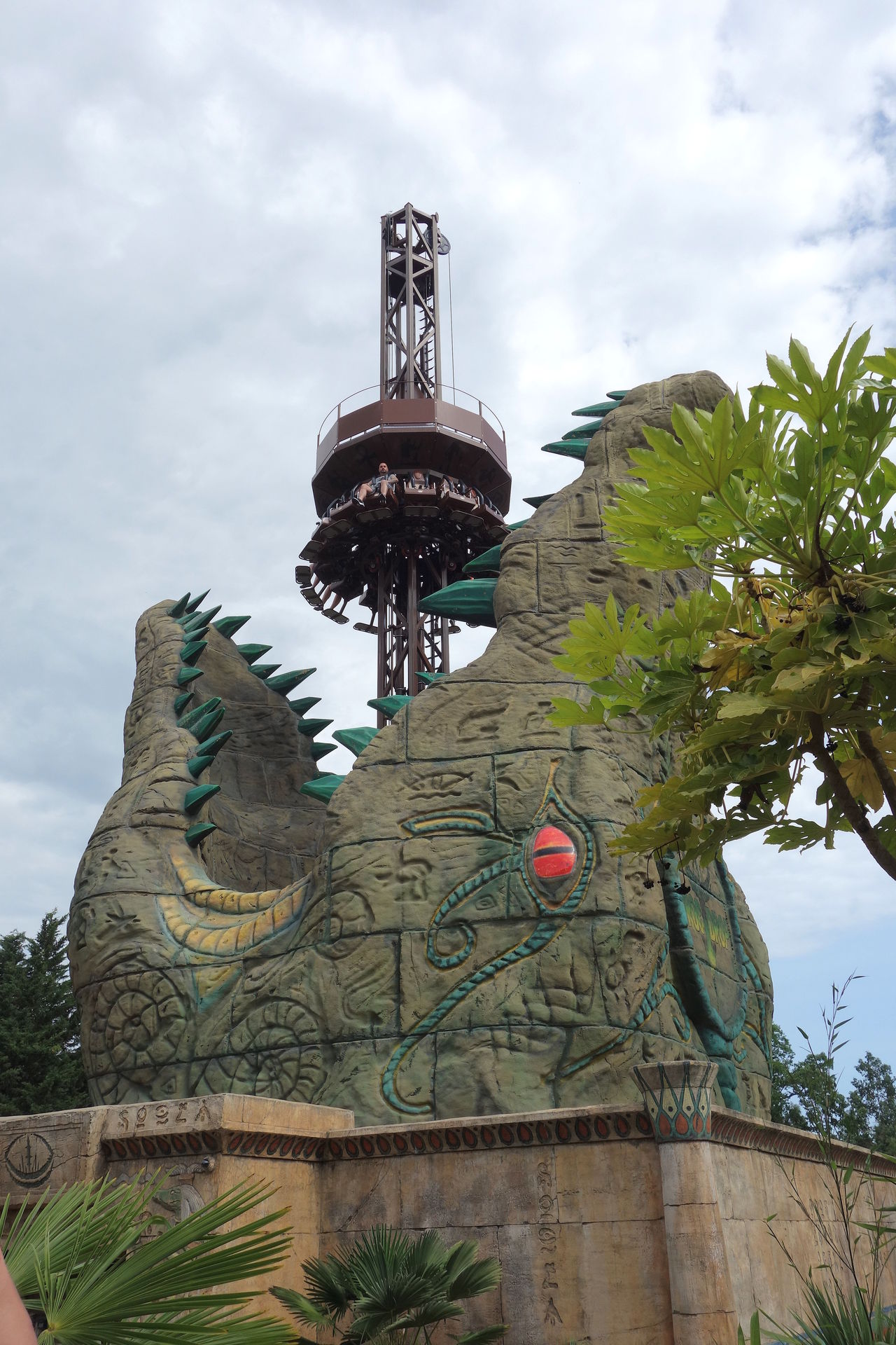 Bis 2019 hatte diesen Platz der Huss Top Spin Rameses Revenge eingenommen, der optisch ähnlich spektakulär ein gutes Stück in den Boden eingelassen war. Zwei Fahrten mussten wir abwarten, was letztlich gute 10 Minuten dauerte. Dann durften wir uns mit den Fahrgästen für die nächste Fahrt vor dem Tor des ägyptischen Tempels versammeln. Die ausbleibende Reaktion auf seine Frage nach einem Single Rider zum Auffüllen der Gondel kommentierte der Mitarbeiter mit einem leicht resignierten "Aaand that's a No, apparently." Dann konnten wir den Tempel betreten und uns auf die 16 Sitze der Gondel verteilen. Die Fahrt selbst ist leider ähnlich lahm wie im Tatzmania.