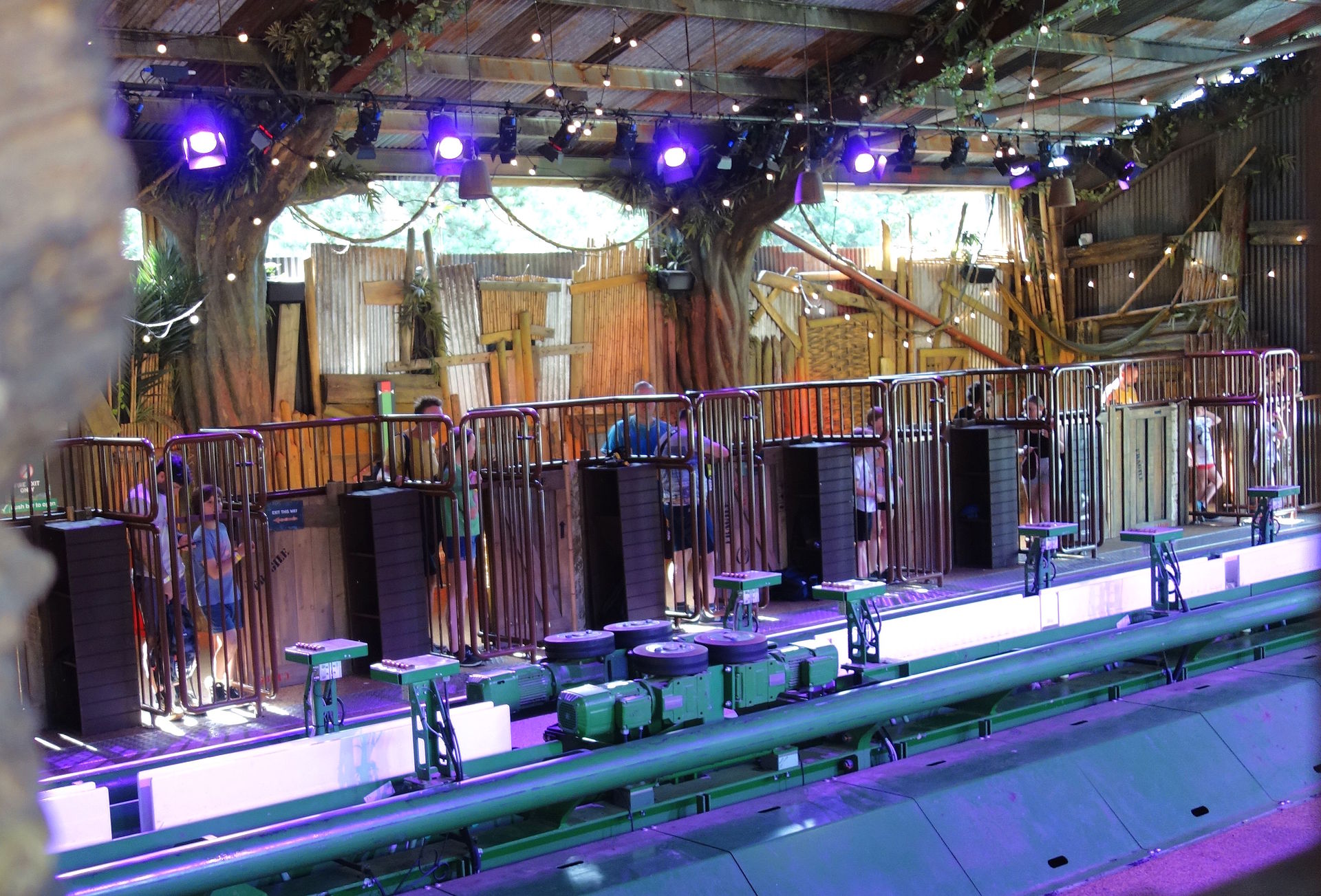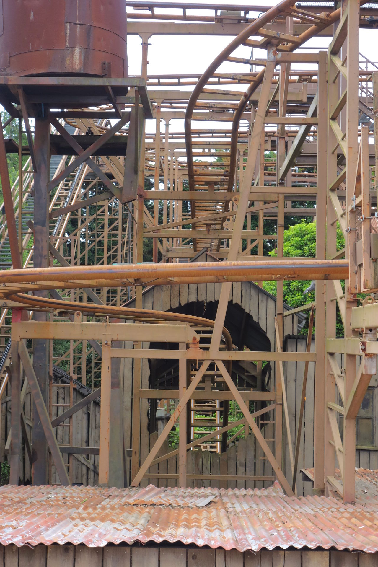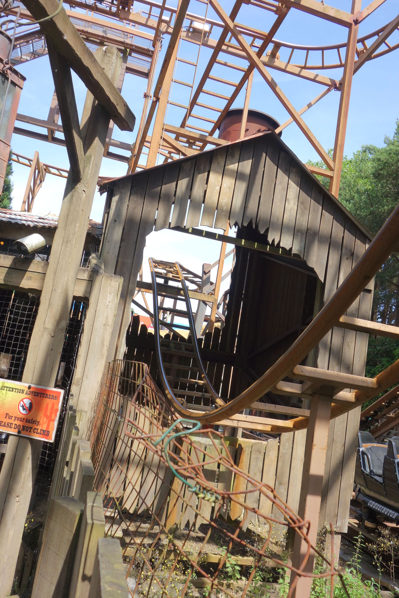 Vekoma-Züge etwas länger als die originalen Arrow-Züge, sodass sie nicht mehr auf das Verschiebegleis passten. Also wurde dieses fest verschweißt und die Züge müssen nun über die Weiche aus der Station heraus per Seilwinde rückwärts in die Werkstatt gezogen werden.