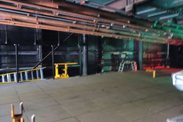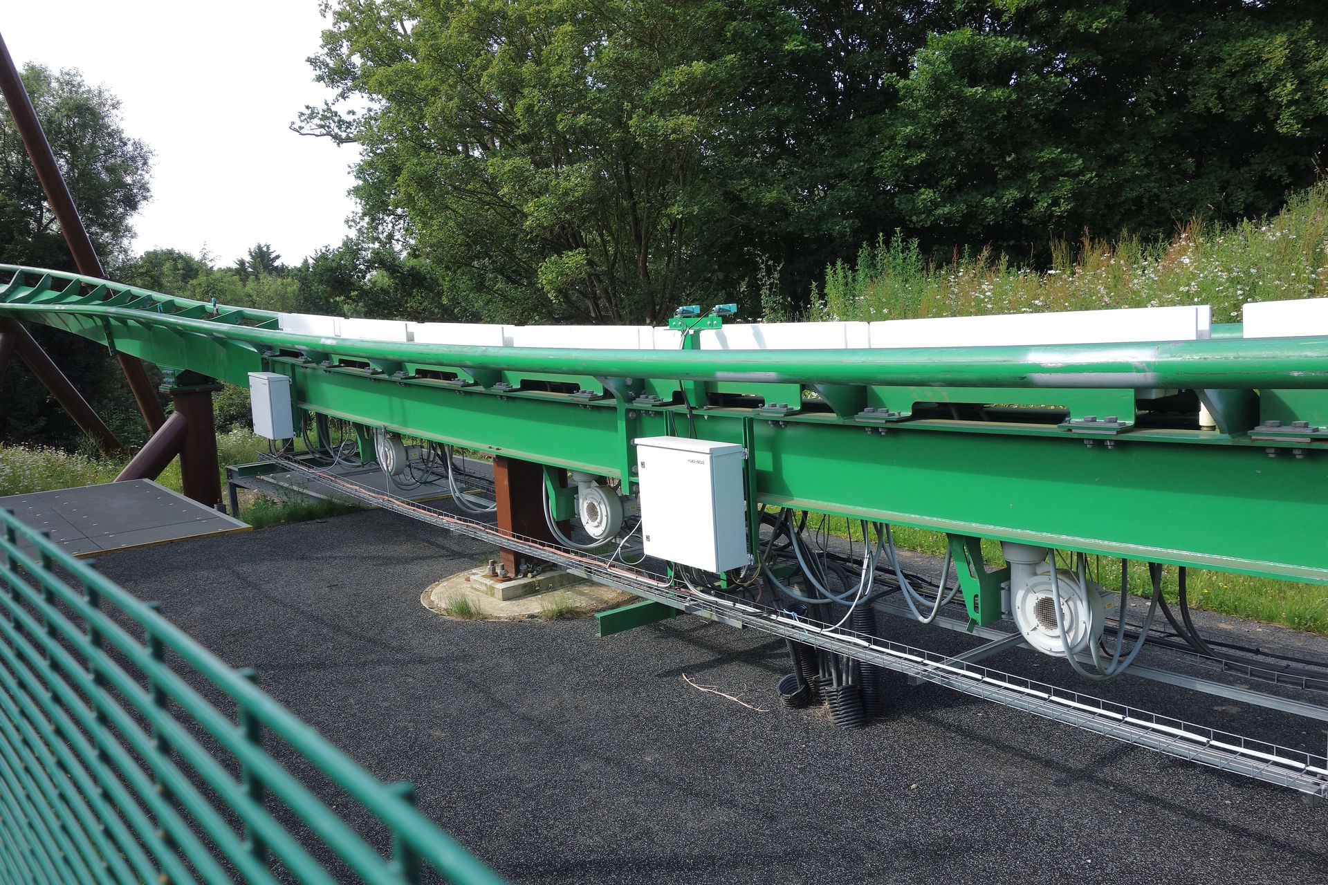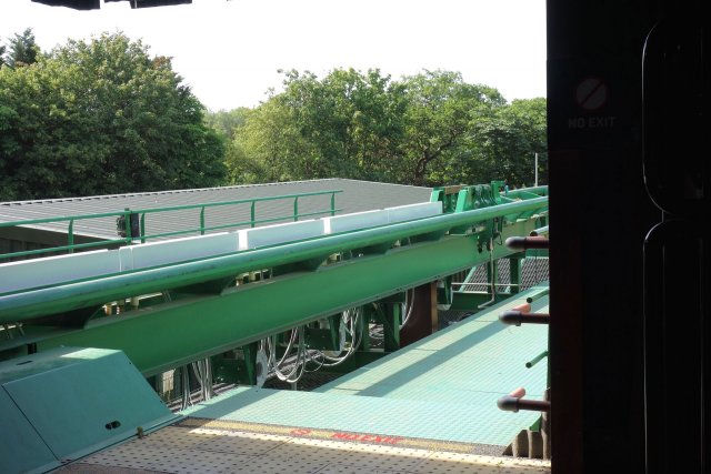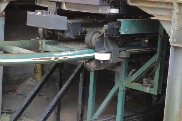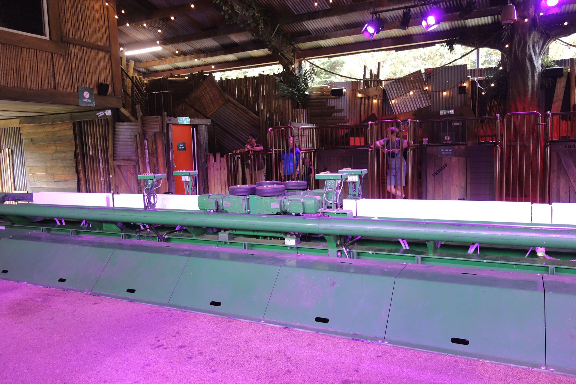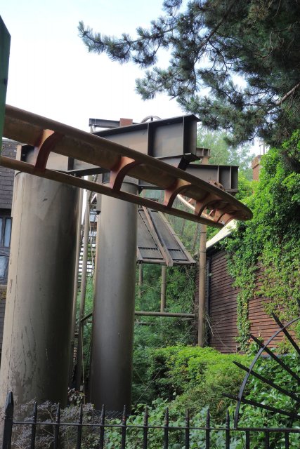 Vekoma-Züge etwas länger als die originalen Arrow-Züge, sodass sie nicht mehr auf das Verschiebegleis passten. Also wurde dieses fest verschweißt und die Züge müssen nun über die Weiche aus der Station heraus per Seilwinde rückwärts in die Werkstatt gezogen werden.
