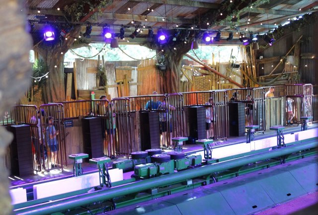 Der verbretterte Weg führte uns an der Paw-Patrol-Baustelle vorbei und über eine Versorgungsstraße hinweg zur Neuheit der Saison 2013 - Zufari. Leider mit einem wenig ansprechenden Zick-Zack-Wartebereich, in dem wir uns runde 40 Minuten die Beine in den Bauch stehen durften. Immerhin sorgte ein Mitarbeiter zwischenzeitlich für Erheiterung, denn da die Schlange bereits bis zum Eingang stand, öffnete er hinter uns eine weitere Schleife des Wartebereichs. Nachdem er das Tor hinter uns geschlossen und die übrigen Wartenden umgeleitet hatte, musste er allerdings feststellen, dass er nun auf der falschen Seite stand. Um zur Station zurückzukommen, musste er das Tor also nochmal öffnen und von unserer Seite aus wieder schließen. Sein Kommentar dazu: "Ich arbeite schon 10 Jahre hier, aber verratet's nicht." - also auf Englisch natürlich.