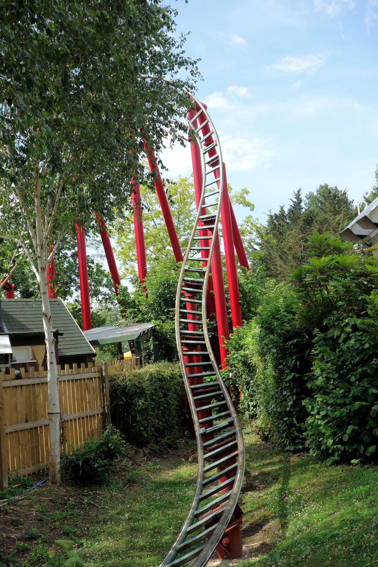 Mit einer Slalom-Abfahrt geht es über den Köpfen der Wartenden hinweg zu einer Aufwärtshelix.