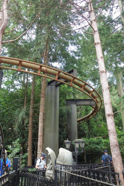 Direkt neben dem Zugang des Themenbereichs folgt ein kleiner Drop mit Kurve, wo die Wagen endlich mal richtig ausschwingen.