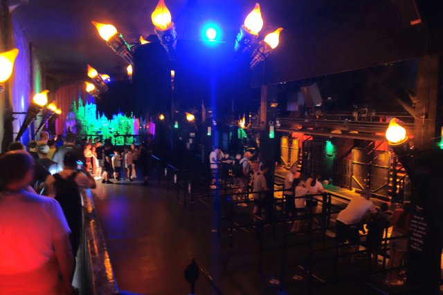 Hier mussten wir dann auch tatsächlich etwas länger warten. Insgesamt eine gute halbe Stunde, wobei der Großteil des Wartebereichs eben unterhalb der Bahn im Wald verläuft. Gruppenweise geht es schließlich in das riesige Stationsgebäude, wo mich der düstere Höhlengang durchaus positiv überraschen konnte. Nach wenigen Windungen erreicht man die eigentliche Station. Eine große Halle mit dem Bahnhofsgleis auf der einen und einer nach unten führenden Rampe auf der anderen Seite.