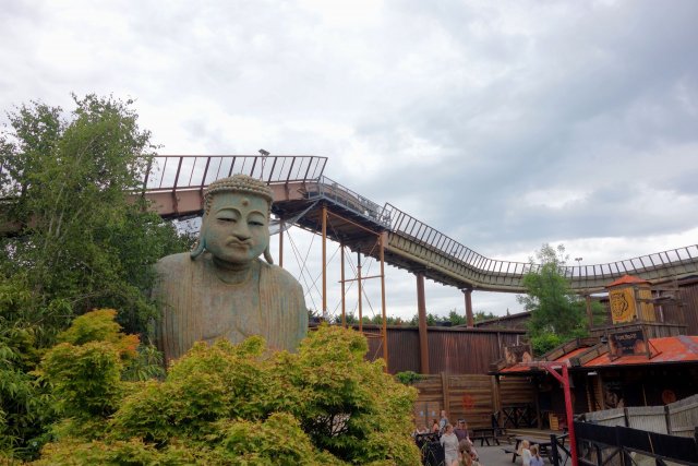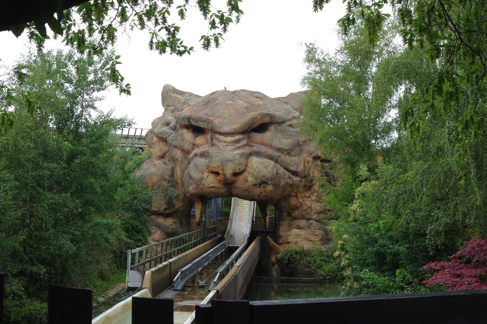 Mack-Anlage mit zwei Schussfahrten waren damals ein Tunnel mit Drachenmaul nach dem ersten Drop und zwei große, den zweiten Drop säumende Steinköpfe, die Angkor Wat repräsentieren sollten. Leider ließ auch hier die Pflege der Kulissen zu wünschen übrig, sodass zunächst 2005 die Felskulisse rund um den zweiten Lifthill (mit Ausnahme des oben zu sehenden Buddhas, der bis heute überlebt hat) und 2013 die Steinköpfe am zweiten Lift, sowie ein Teil des Tunnels abgerissen werden mussten. Zur Saison 2018 erfolgte dann die Umgestaltung des Themenbereichs zum Land of the Tiger und der Wildwasserbahn zu Tiger Rock.