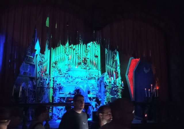 Jedenfalls soll das Gesicht des Animatronics auf einer Wachsfigur des bekannten Schlagzeugers und Sängers basieren. Leider sieht man die Figur halt nur von hinten, sodass sich das nicht wirklich verifizieren lässt. Eine zweite, identische Figur spielte im Restaurant Black Forest Chateau auf, ehe dieses zunächst zu einer McDonald's- und dann zu einer Burger-King-Filiale wurde. Inzwischen heißt der Laden Vampire's Burger Kittchen. Wir durften schließlich zu fünft einen größeren Teil der Warteschlange überholen, da man eine ungerade Anzahl von Passagieren suchte. Einer von uns durfte zu einem Einzelfahrer in die Front Row, die vier anderen verteilten sich auf die Reihen 2 und 3.