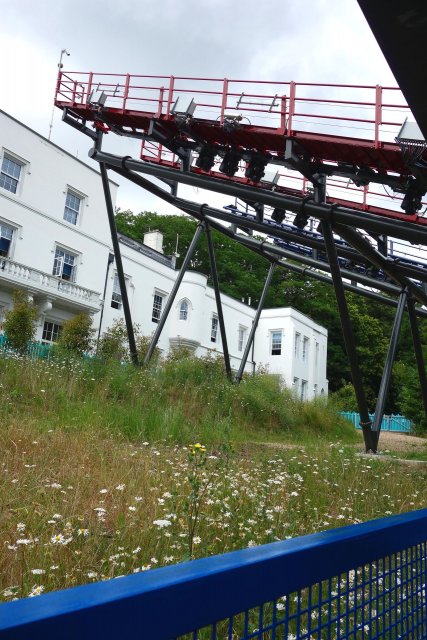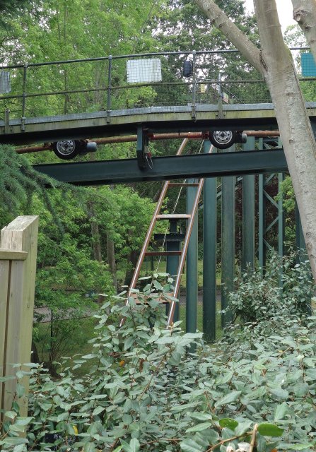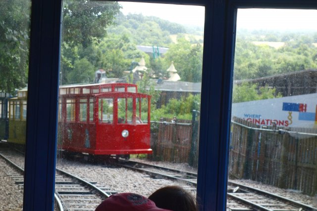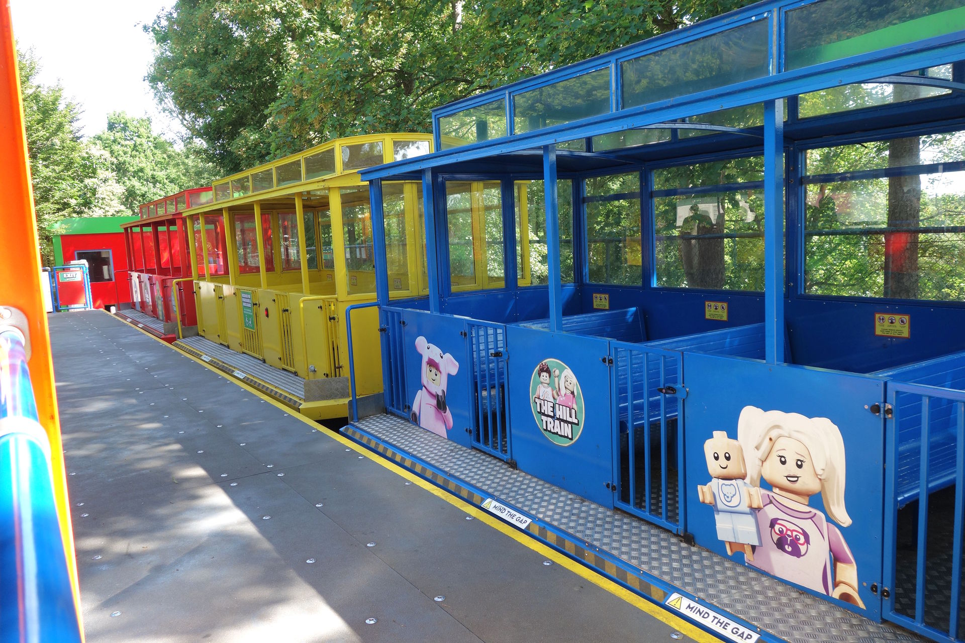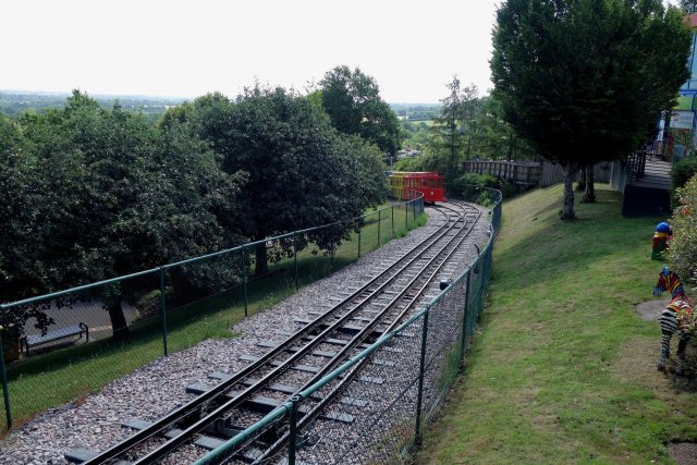 Dabei ist der Hill Train sogar älter als das Legoland selbst, denn es handelt sich um das einzige Überbleibsel des Windsor Safari Parks. Die Standseilbahn war 1991 im letzten Jahr des Parks eröffnet worden. Leider konnte ich weder eine valide Info zum Hersteller, noch Bilder von damals finden. Daher kann ich leider nicht prüfen, ob es ursprünglich tatsächlich in den Stationen nur ein einzelnes Gleis und in der Mitte eine Ausweiche mit Weichen gegeben hat. Der heutige Hill Train besitzt in jedem Fall keine Weichen, denn jeder der beiden an einem umlaufenden Stahlseil befestigten, 3-teiligen Züge besitzt ein eigenes Gleis.