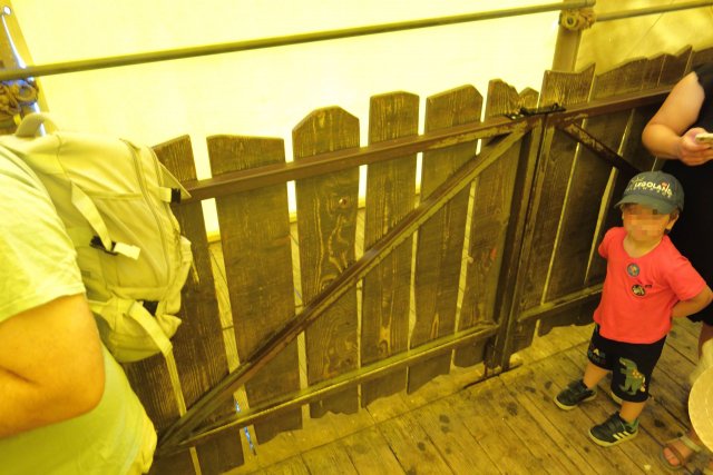Beim Passieren des Eingangs war die Wartezeit noch mit 20 Minuten angegeben gewesen. Als ich das Ende der Schlange auf der Burgmauer erreicht hatte, sah ich, dass die Angabe zwischenzeitlich auf 35 Minuten heraufgesetzt worden war. Wenig später behauptete eine Durchsage, dass die Wartezeit sogar 45-50 Minuten betrage. Glücklicherweise kam die ursprüngliche Angabe der Realität dann doch am nächsten, auch wenn die beobachtete Abfertigung in der Tat eher schleppend verlief. Wobei die Abfertigung an sich nicht das Problem war. Bevor der fertige Zug abfahren konnte, erfolgten zunächst noch die Sicherheitsanweisungen. Und zwar erst mit einer normalen Durchsage und dann nochmal vom Band mit Merlins Stimme.
