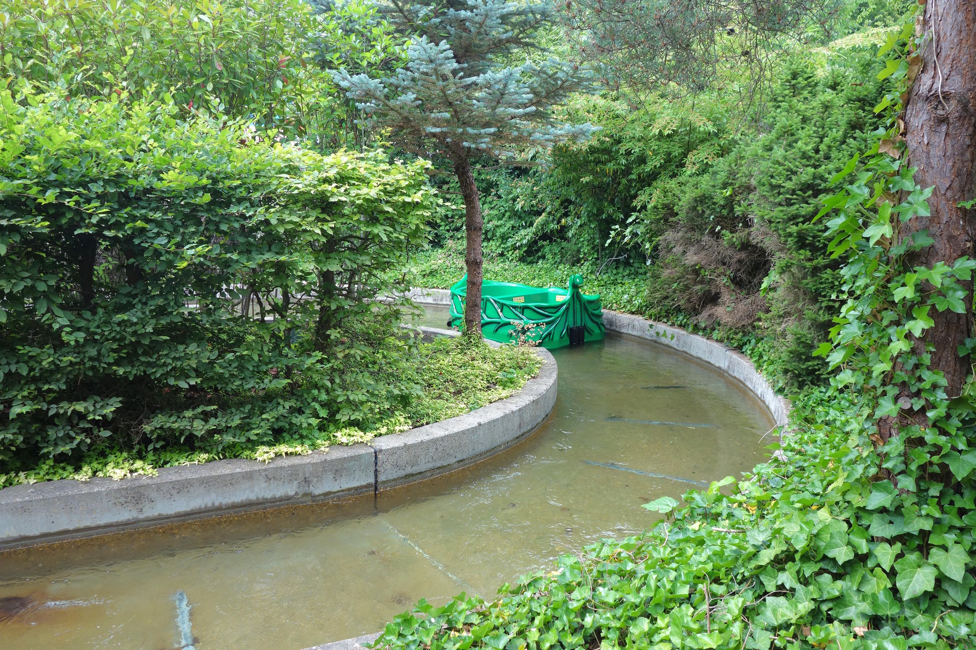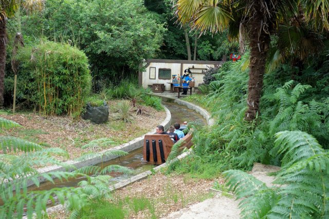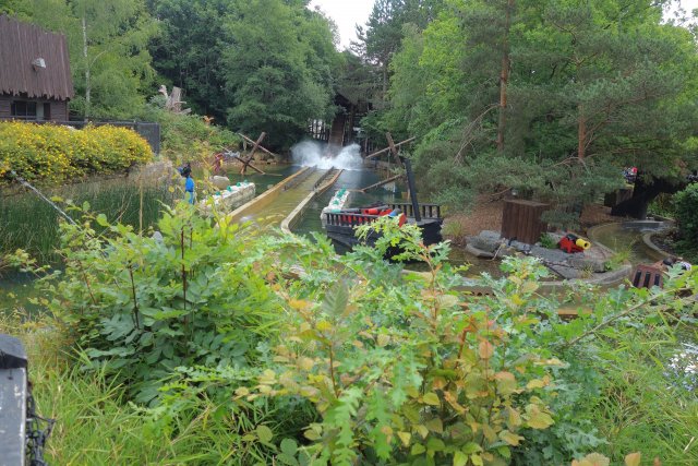 Damit fehlte mir als letzte größere Attraktion nun lediglich noch die Wildwasserbahn. Allerdings musste ich dafür wieder einmal quer durch den gesamten Park und in einer guten Stunde bereits wieder zurück, um pünktlich zum Gruppenfoto und der vorzeitigen Abfahrt am Parkeingang zu sein. Leider war die angezeigte Wartezeit mit 45 Minuten im Vergleich zum Vormittag nur unwesentlich gesunken. Da ich aber sonst nichts mehr vorhatte, stellte ich mich einfach trotzdem mal an. Hätte ja sein können, dass es doch schneller geht. Sonderlich zügig bewegte sich die Schlange jedoch nicht voran, ganz im Gegensatz zur Uhrzeit.