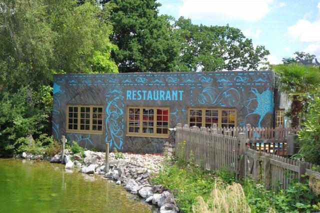Die verbliebene Zeit nutzte ich, um meine leeren Flaschen an einem der Trinkwasserspender im Park aufzufüllen. Und etwas zu Essen brauchte ich auch dringend. Hierzu steuerte ich die Pirate's Burger Kitchen gleich neben der Wildwasserbahn an. In der großen Halle waren kaum noch andere Besucher unterwegs und die Klimaanlage sorgte zusätzlich für einen frostigen Empfang. Über einen der Touchscreens gab ich meine Bestellung auf und blechte stolze £25 - das sind fast 30€!