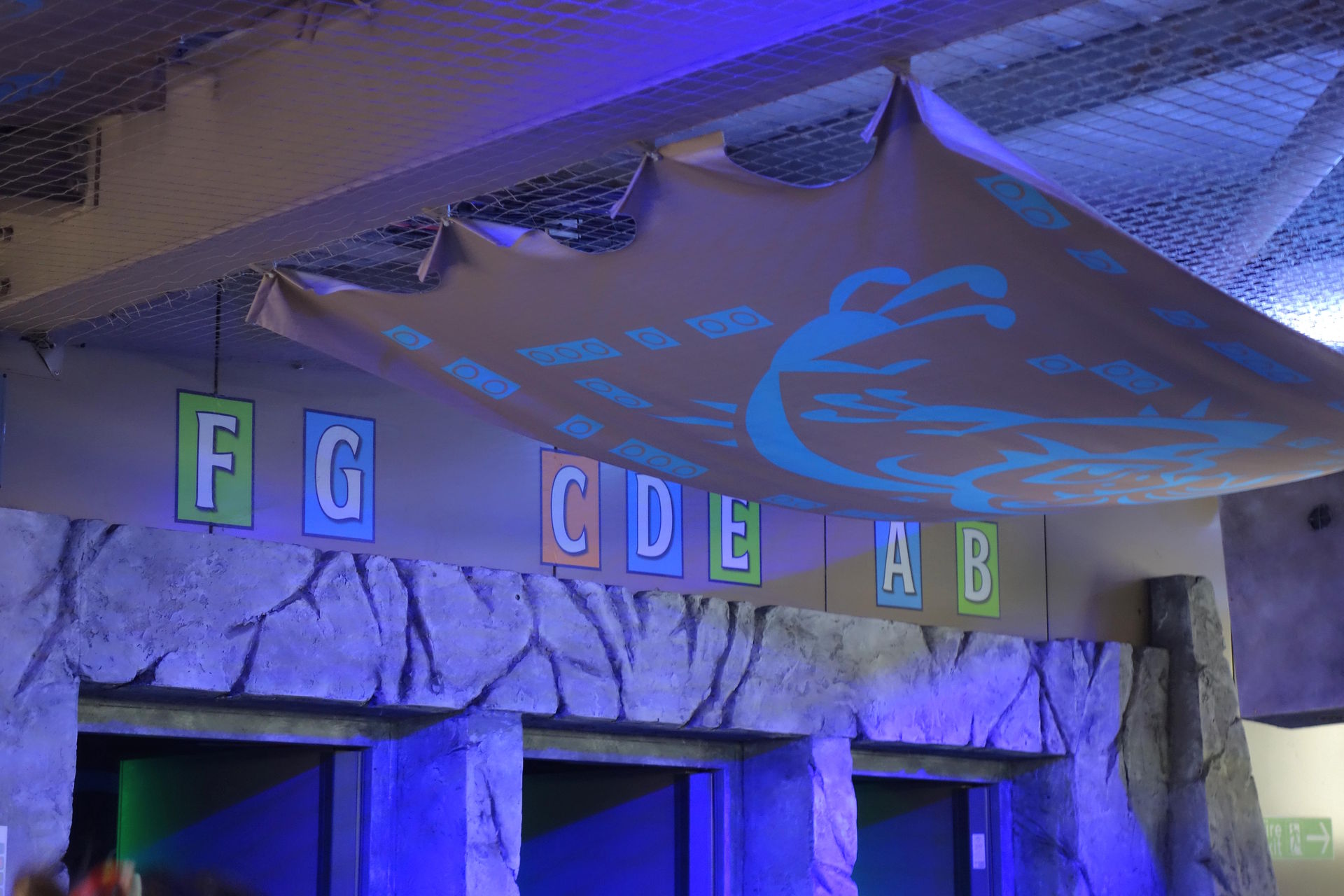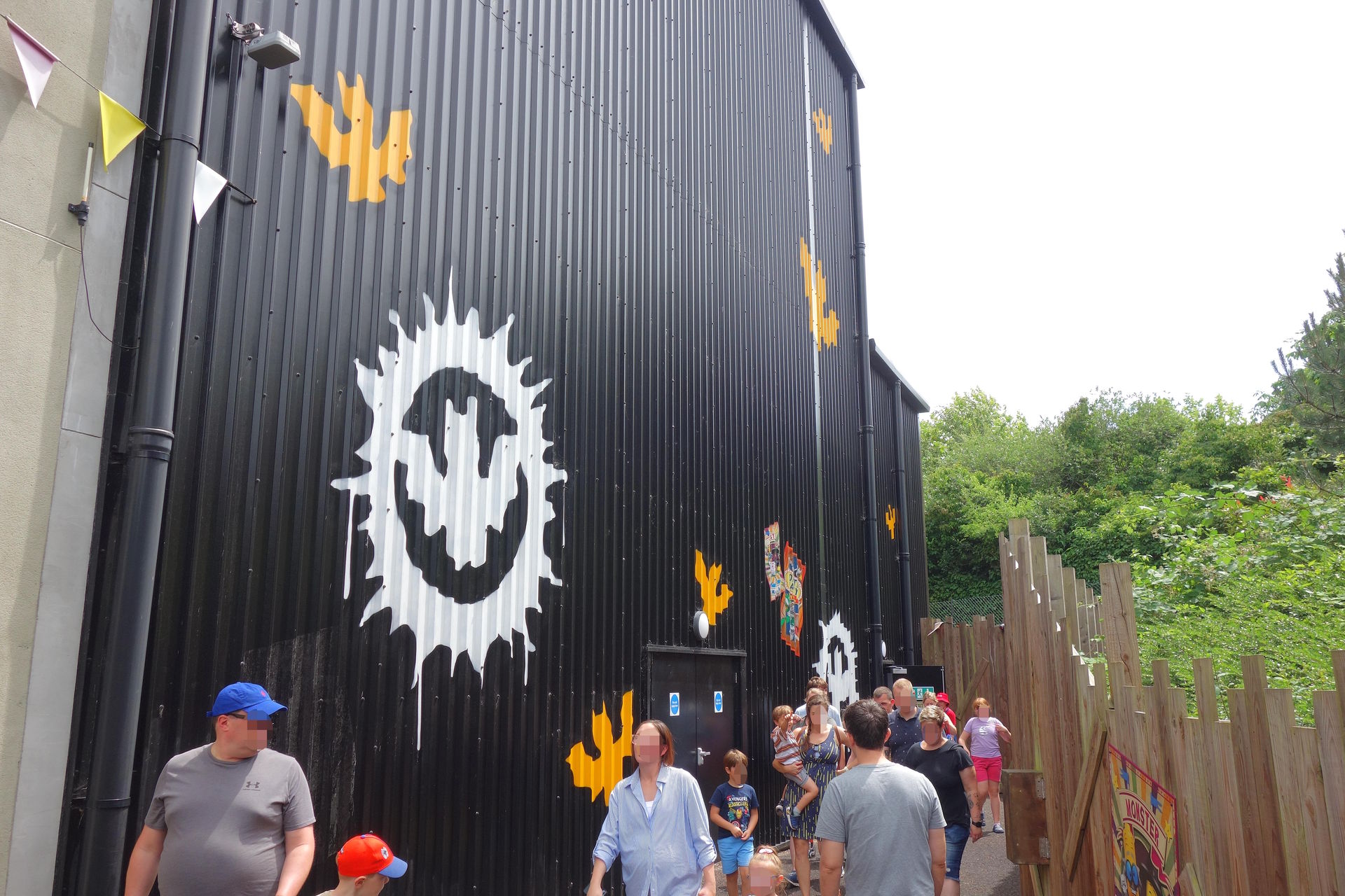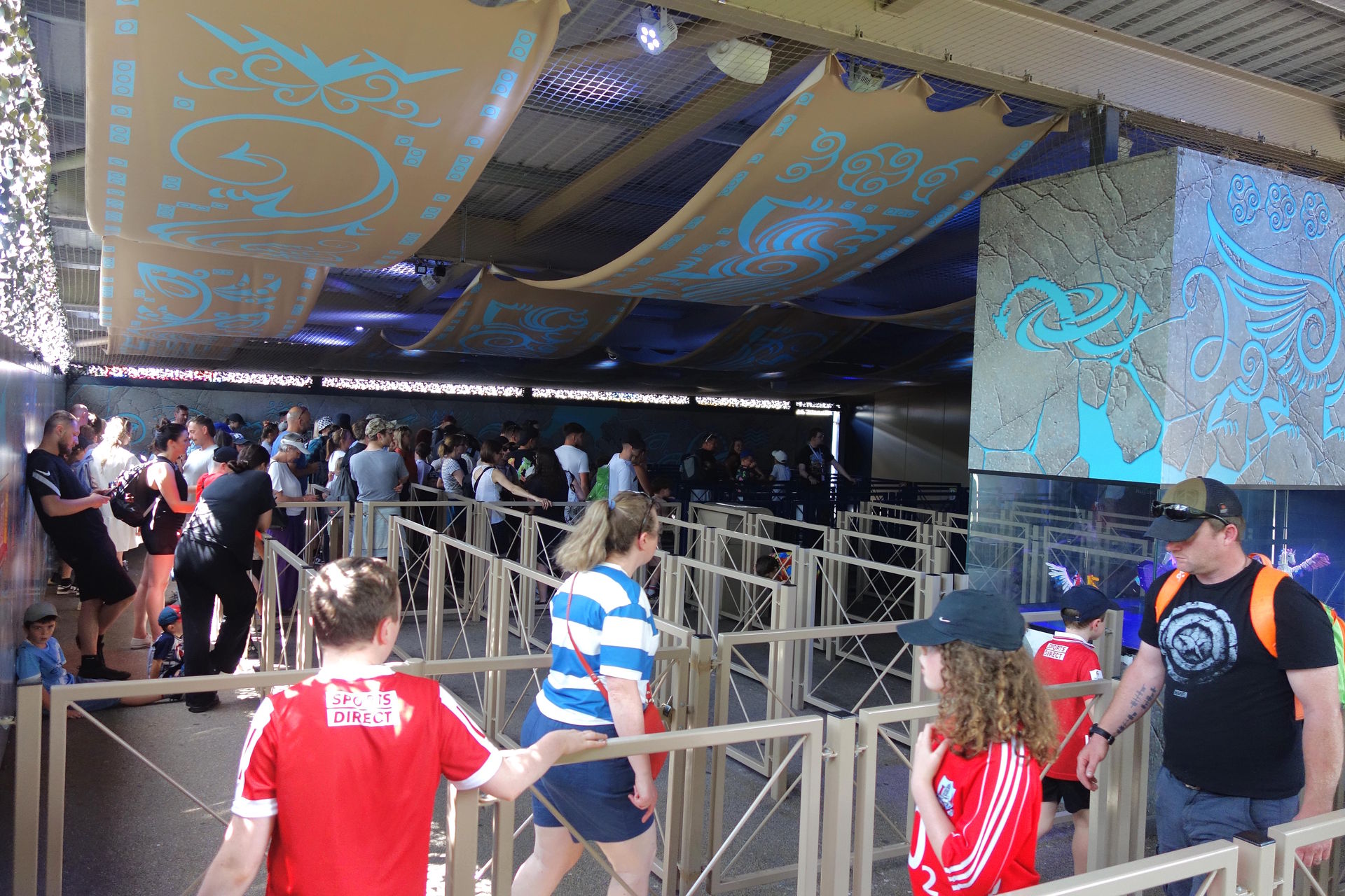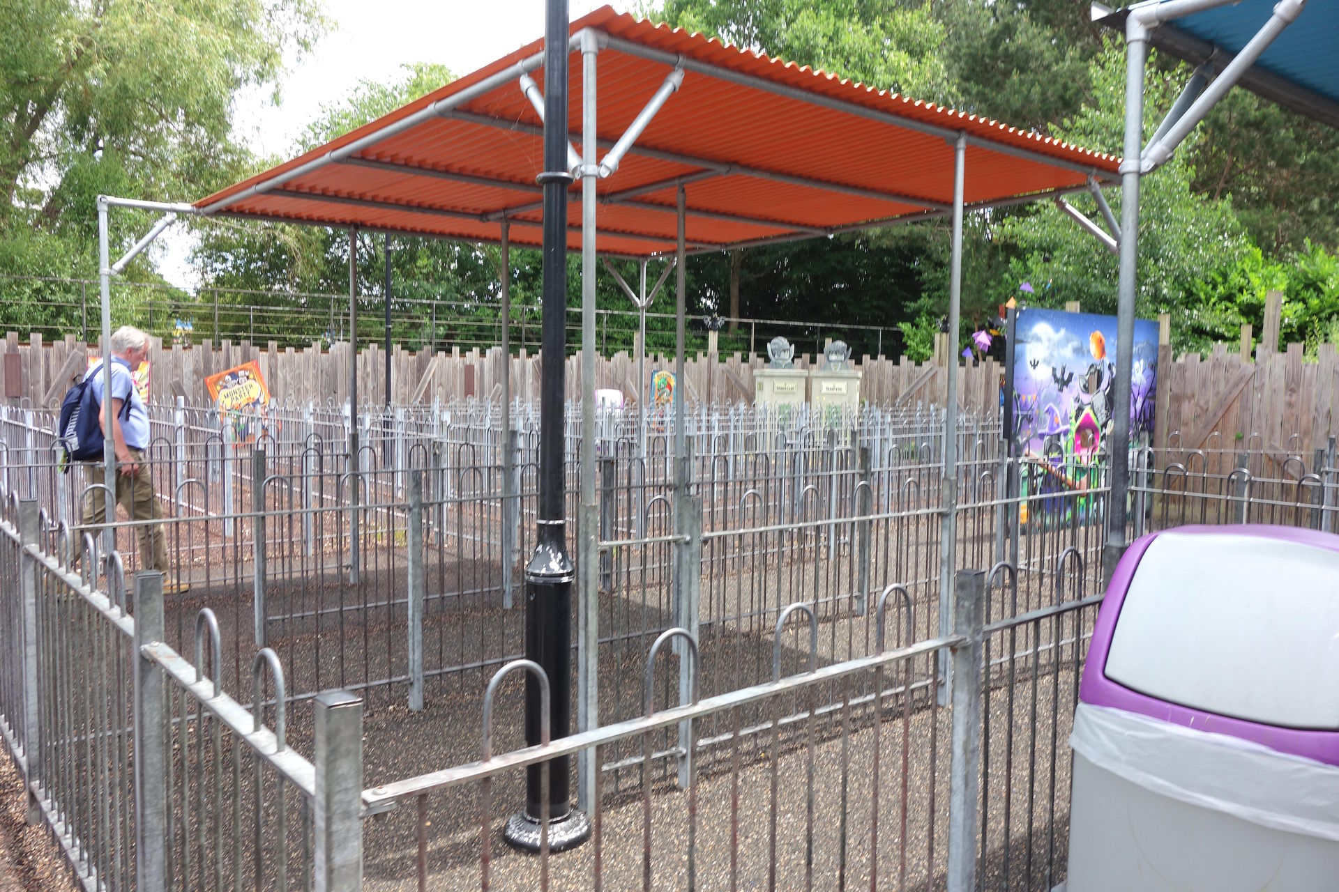 Darauf hat man ab dem zweiten Jahr aber schon wieder verzichtet. Stattdessen wird die Fläche nun als Kids Zone ausgewiesen. Während die Eltern sich also nebendran in der langweiligen Schlange Meter für Meter nach vorne schieben, können sich ihre Kinder dort so lange austoben. Am anderen Ende der Fläche können sie sich dann wieder einsammeln lassen. "Meet your Grown Ups here", heißt es dazu auf einem Schild. Wenige Meter weiter ist ein Mitarbeiter postiert, der zum einen das Einsortieren der Fastrack-Nutzer ermöglicht, und zum anderen darauf achtet, dass der verbleibende Wartebereich nicht zu voll steht. Denn das eigentliche Fahrgeschäft wurde aus Platzgründen etwas abseits gebaut und mit einem planenbehangenen Weg - aufgeteilt in Wartebereich und Ausgang - an das ehemalige Zirkuszelt angeschlossen.