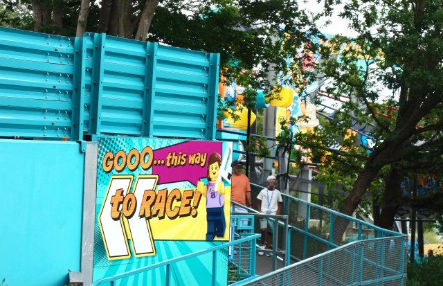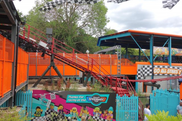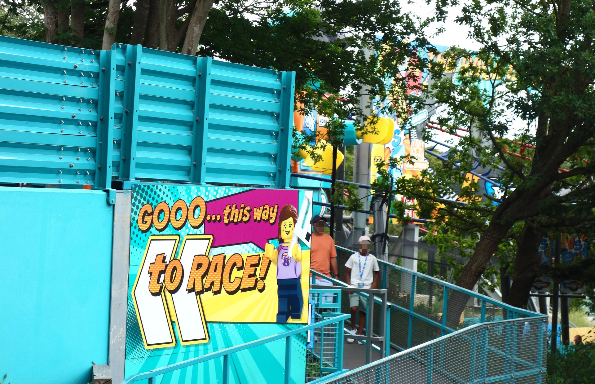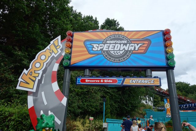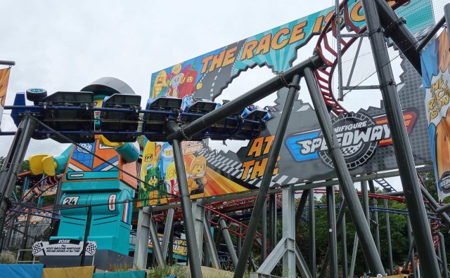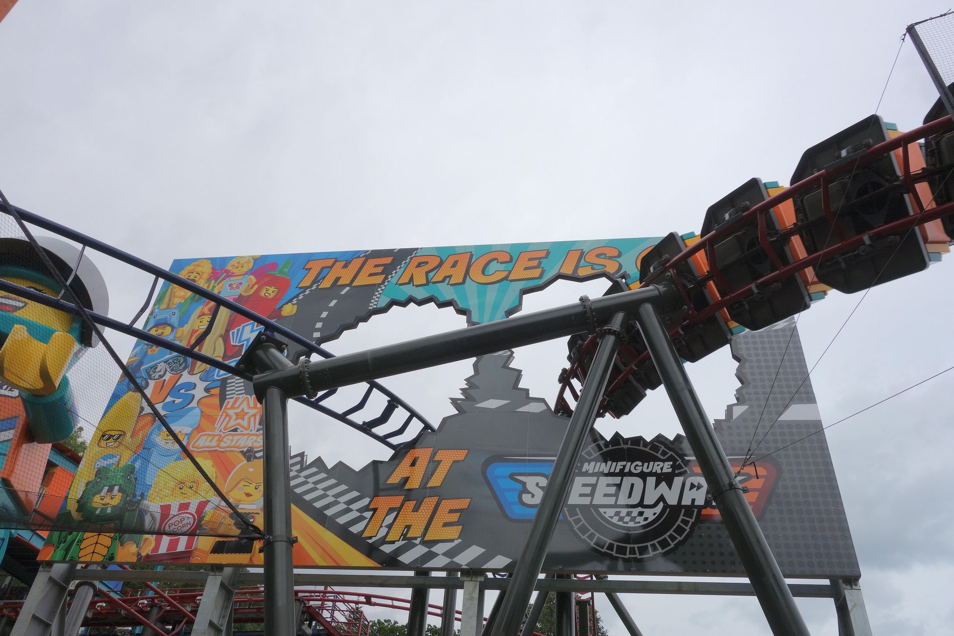 Hat man nach Rückkehr der Züge dann Platz genommen, kann das Rennen auf dem Minifigure Speedway beginnen. Zunächst rückwärts, die beiden inneren Lifthills hinauf. Dann geht es hinab, man rauscht durch die Station und passiert eine leicht ansteigende Gerade mit Bremsen, ehe sich die beiden Strecken in einer abtauchenden Kurve voneinander entfernen.