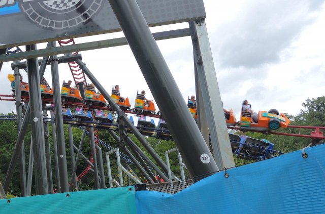 So kam es dann auch, dass bei allen drei von mir absolvierten Fahrten - angesichts der humanen Wartezeit hatte ich im Gegensatz zu anderen FKFlern darauf verzichtet, bei der Einteilung zu diskutieren und auf die richtige Seite zu warten, und war damit zunächst zweimal im Team All Stars gelandet, ehe ich auch das Team Legends abhaken konnte - die blaue Spur den Sieg einfuhr. Bei der ersten Fahrt tatsächlich denkbar knapp, die beiden übrigen dann doch recht deutlich. Auch bleibt das Rennfeeling zwischendurch leider ein wenig auf der Strecke, da sich die Züge einfach zu weit voneinander entfernen. Beim Richtungswechsel auf den Lifthills kann man noch halbwegs abschätzen, wie das Rennen läuft, ansonsten lässt sich (zumindest bei knappen Rennen) aufgrund der gegenläufigen Streckenführungen nicht wirklich sagen, wer gerade die Nase vorne hat.