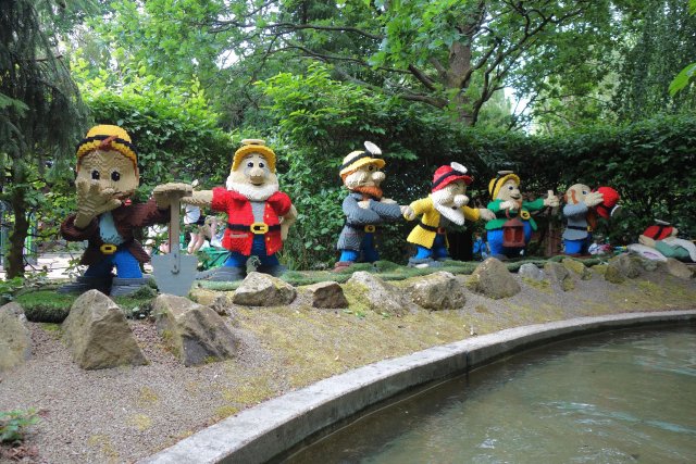 - für einen Buccaneer-Burger samt Pommes und Getränk. Fairerweise muss ich dazu sagen, dass die "normalen" Burger deutlich günstiger gewesen wären. Der Buccanneer-Burger war ein Special in einem schwarzem Burgerbrötchen. Der brauchte dann wohl auch etwas länger zur Zubereitung, denn zwei nach mir aufgegebene Bestellungen wurden noch vorher übergeben. Dafür versuchte mir die Dame hinter der Theke aber wohl klar zu machen, dass ich mit dem Kauf dieses Burgers auch die Möglichkeit hätte, an einem Glücksrad zu drehen. Nachdem ich zunächst aus Zeitgründen abgewunken hatte, folgte ich ihr letztlich in Richtung des Glücksrads. Sie hatte meine Absage aber wohl doch angenommen und bog einfach in die Küche ab. Nunja, ich machte mich dann also mit meinem Abendessen auf den Weg in Richtung Treffpunkt am Parkeingang. Nochmal fix durchs Miniland und über Rampen und Treppen den Berg hinauf.
